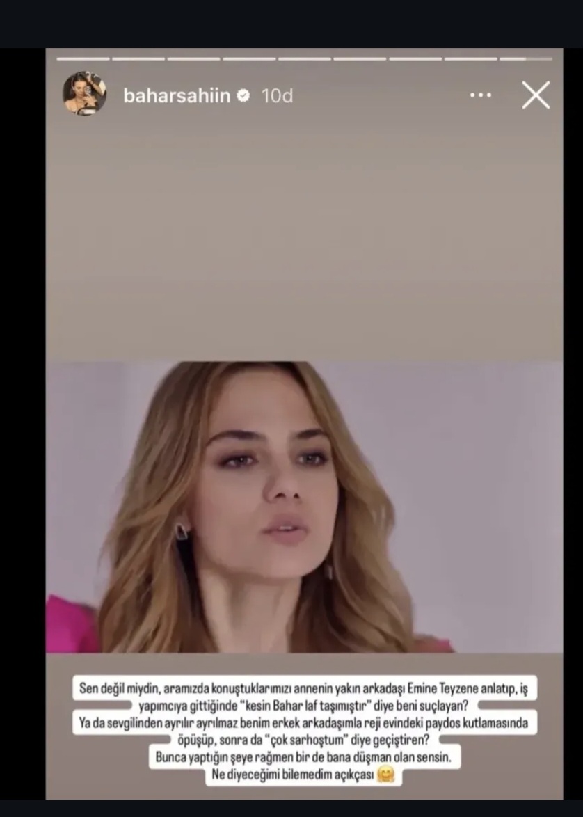 Бахар недавно призналась что во время съёмок подверглась в псих.давление со стороны Мине, и никто не защищал её. В ответ Сера заступилась за Мине, а Дениз Угур(Сехер) заступилась за Бахар. Вообщем, Бахар сказала что Сера поцеловалась с её парнем, тащила разговоры. Дениз сказала что Мине Тугай закрутила роман с директором канала, изменила сценарий в пользу своей героини и испортила сериал. На Мине не удивилась, но Сера оказалась змеей, завистливая Молодец Бахар затмила всех актрис в сериале, одна ташила сериал